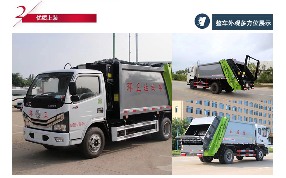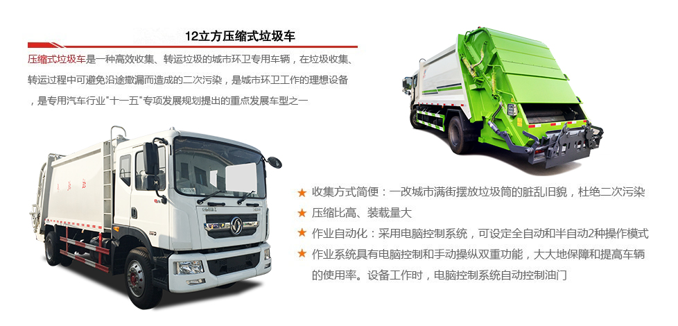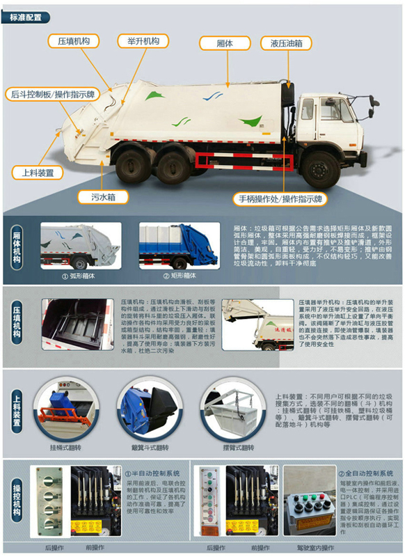 標準: 壓縮式垃圾車:采用機、電、液聯(lián)動控制系統(tǒng)、電腦控制及手動操作系統(tǒng),通過填裝器和推鏟等裝置實現(xiàn)垃圾倒入、壓碎或壓扁,并將垃圾擠入車廂并壓實和推卸。