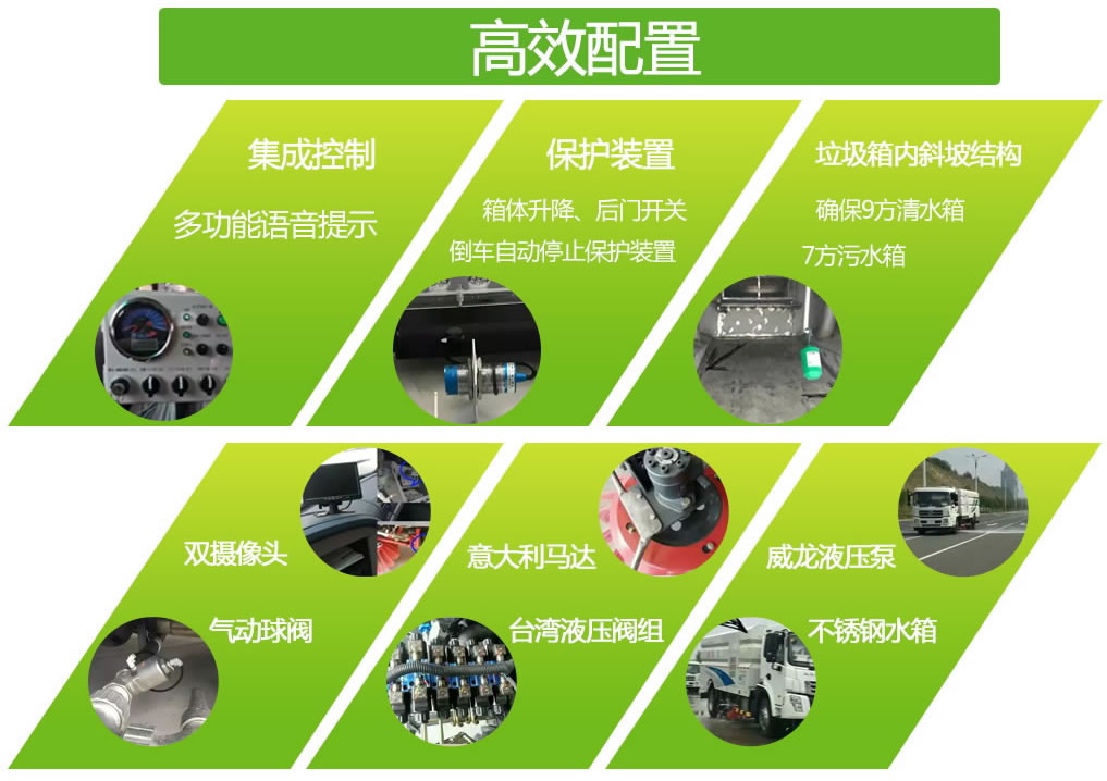 4個中置掃盤,帶三擋調(diào)速,江鈴副發(fā)動機(jī),大力馬達(dá),施耐德控制開關(guān),臺灣電磁閥組,免維護(hù)分離式離合器,北玻臺信免維護(hù)風(fēng)機(jī),不銹鋼水箱,不銹鋼垃圾箱,尾部LED箭頭燈,手動泵應(yīng)急系統(tǒng),刷臂轉(zhuǎn)動機(jī)構(gòu)使用高新耐磨工程隔套,免打黃油,精密冷彎無縫液壓油管。