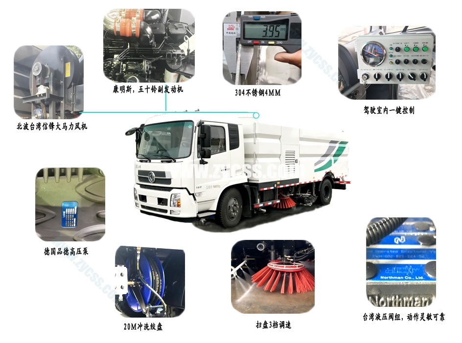 軸距4700,康機(jī)ISB180 50,東風(fēng)6檔,9.00R20輪胎,空調(diào) 2、上裝配置: 帶掃盤4把,康明斯副發(fā)動(dòng)機(jī);意大利馬達(dá);施耐德控件開關(guān);臺(tái)灣電磁閥組;免維護(hù)自分離式離合器;免維護(hù)風(fēng)機(jī);不銹鋼水箱;不銹鋼垃圾箱;尾部LED箭頭燈;手動(dòng)泵應(yīng)急系統(tǒng);前掃刷臂轉(zhuǎn)動(dòng)機(jī)構(gòu)使用高新耐磨工程隔套,免打黃油;精密冷彎無縫液壓油管。 可選配置:前沖、后灑、噴霧、自潔卷盤、作業(yè)監(jiān)控系統(tǒng)、輔助吸管裝置、推雪鏟等。