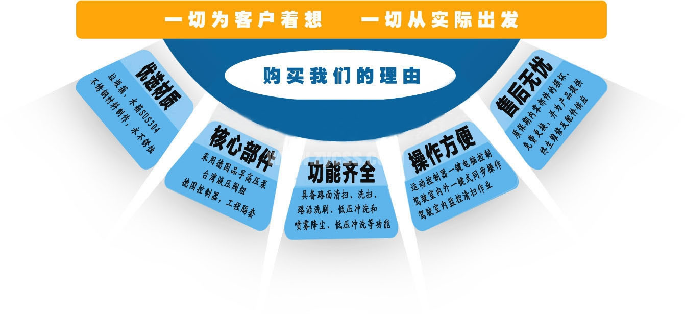 2、采用副發(fā)動(dòng)機(jī)專門驅(qū)動(dòng)風(fēng)機(jī)和液壓系統(tǒng),保證行駛過程中能繼續(xù)工作,保證清掃過程的連續(xù)性。 3、采用"中置四盤刷+后置吸嘴"的結(jié)構(gòu)布置,便于清掃裝置與吸嘴的調(diào)整和維護(hù),轉(zhuǎn)場(chǎng)時(shí)整車通過性好。 4、副發(fā)動(dòng)機(jī)與風(fēng)機(jī)之間的傳動(dòng)設(shè)置設(shè)有自動(dòng)離合器,可保證副發(fā)動(dòng)機(jī)空載起動(dòng)和停機(jī)時(shí)與風(fēng)機(jī)的自動(dòng)脫離,降低對(duì)副發(fā)動(dòng)機(jī)的沖擊,提高了副發(fā)動(dòng)機(jī)的工作可靠性和使用壽命。 5、掃盤有遇障避讓保護(hù)功能和復(fù)位功能,遇到障礙物后回縮,越過障礙物后復(fù)位。 6、根據(jù)不同清掃工況,在不增加副機(jī)油門的情況下,實(shí)現(xiàn)掃盤高中低三檔調(diào)速,即能保證在各種污染狀況下都有良好的清掃效果,同時(shí)節(jié)省油耗以及刷毛的損耗。 7、采用可隨路面自動(dòng)找平的全浮動(dòng)式吸嘴,吸塵效果好,使用壽命長(zhǎng)。 8、進(jìn)口液壓閥組,能保證整車的液壓動(dòng)作的穩(wěn)定性和流暢性。 9、進(jìn)口液壓馬達(dá),能保證掃盤的工作穩(wěn)定性,使用壽命長(zhǎng)。 10、進(jìn)口原料制成的外翻式吸塵管,有效防止吸塵管被劃破、凍裂,增加使用壽命。 11、精密無縫冷彎液壓油管,內(nèi)壁無氧化雜質(zhì),保證液壓油路清潔,不堵閥。 12、掃盤刷臂內(nèi)使用高性能工程塑料隔套,耐磨性好,免打黃油免維護(hù),節(jié)省人力物力。 13、不銹鋼水箱、垃圾箱,可抗一般性腐蝕,增加箱體的使用壽命。 14、超寬后門且大于90度的開啟角度,更易于傾倒垃圾,清理垃圾箱。 15、垃圾箱傾翻角度大于48度,易于傾倒垃圾。 16、可加裝前沖、后灑、噴霧、自潔卷盤、作業(yè)監(jiān)控系統(tǒng)、輔助吸管裝置、推雪鏟等。 ![]() 產(chǎn)品功能特點(diǎn)